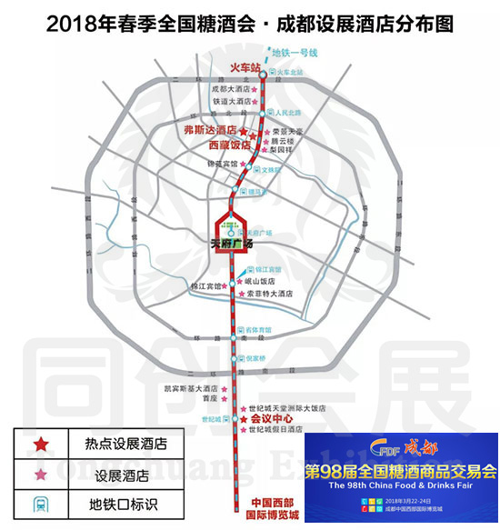 友源假日酒店(绿色食品专区):(成都市金牛区人民北路二段266号,省图书大厦旁)位于火车北站,与成都大酒店相对,从火车站至西藏饭店酒店必经之路。1:位置好、交通便利。酒店位于火车北站第一站,集火车、汽车、地铁、公交等交通枢纽位置,龙头布展酒店。2.酒店结构好。1-6楼展厅,7-11楼房间,全开放式展厅,门前广场开阔,层间高,会期人员流动性强,展厅设展面积约4000平方米,房间呈一字型布局。3.性价比非常高。在成都春季糖酒会所有布展酒店里价格最实惠。