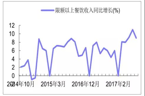 餐饮业迎回暖,大众连锁餐饮成重要力量。受2012年限制三公消费政策的打击,餐饮行业也迎来漫长调整期,在经历了三年的深度调整后,餐饮业从2015年开始进入复苏期,大众餐饮不断崛起发展势头良好,限额以上餐饮业收入增速也由14年低点的负值上升到17年的双位数。