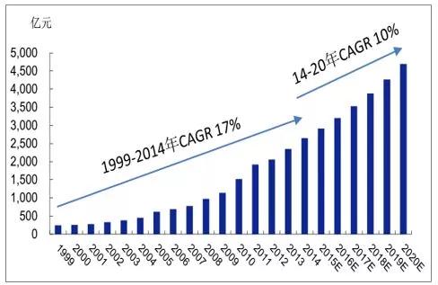 据调味品行业统计数据,2000-2014年调味品行业CAGR高达18.28%,假定2014-2020年 CAGR为 10%,则2020年中国调味品行业收入将达到近 5000亿元,考虑到餐饮渠道占比接近一半,则对应餐饮渠道调味品使用规模在2500亿左右后续空间和弹性仍十分可观。